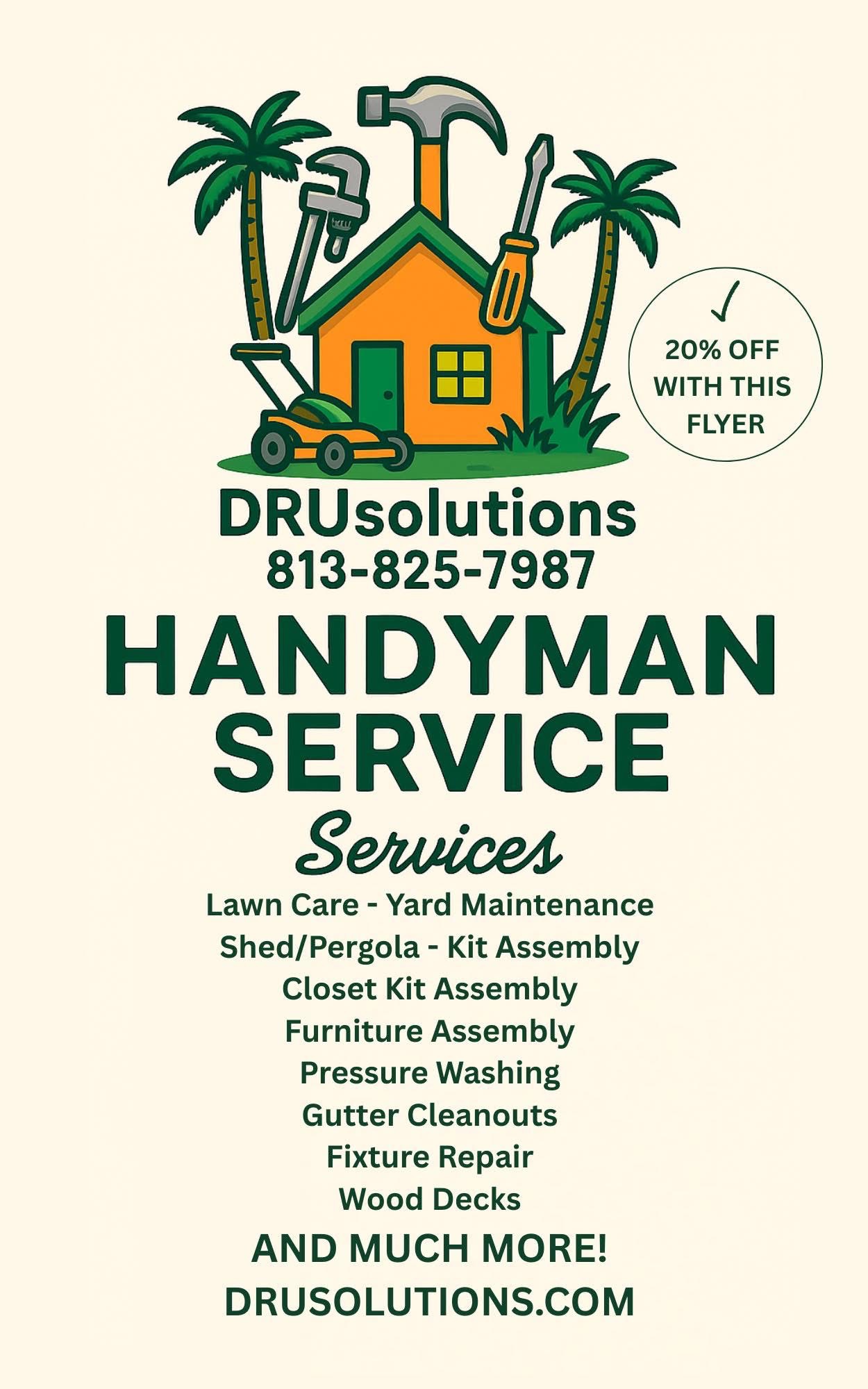 DRUsolutions Handyman provides a range of Handyman services in Brooksville, FL, US. We tackle diverse home repair and maintenance needs for our clients, from drywall patching and interior painting to furniture assembly and fixture installations. Our team is dedicated to delivering reliable and meticulous work on every task we undertake, ensuring your property is well-cared for.